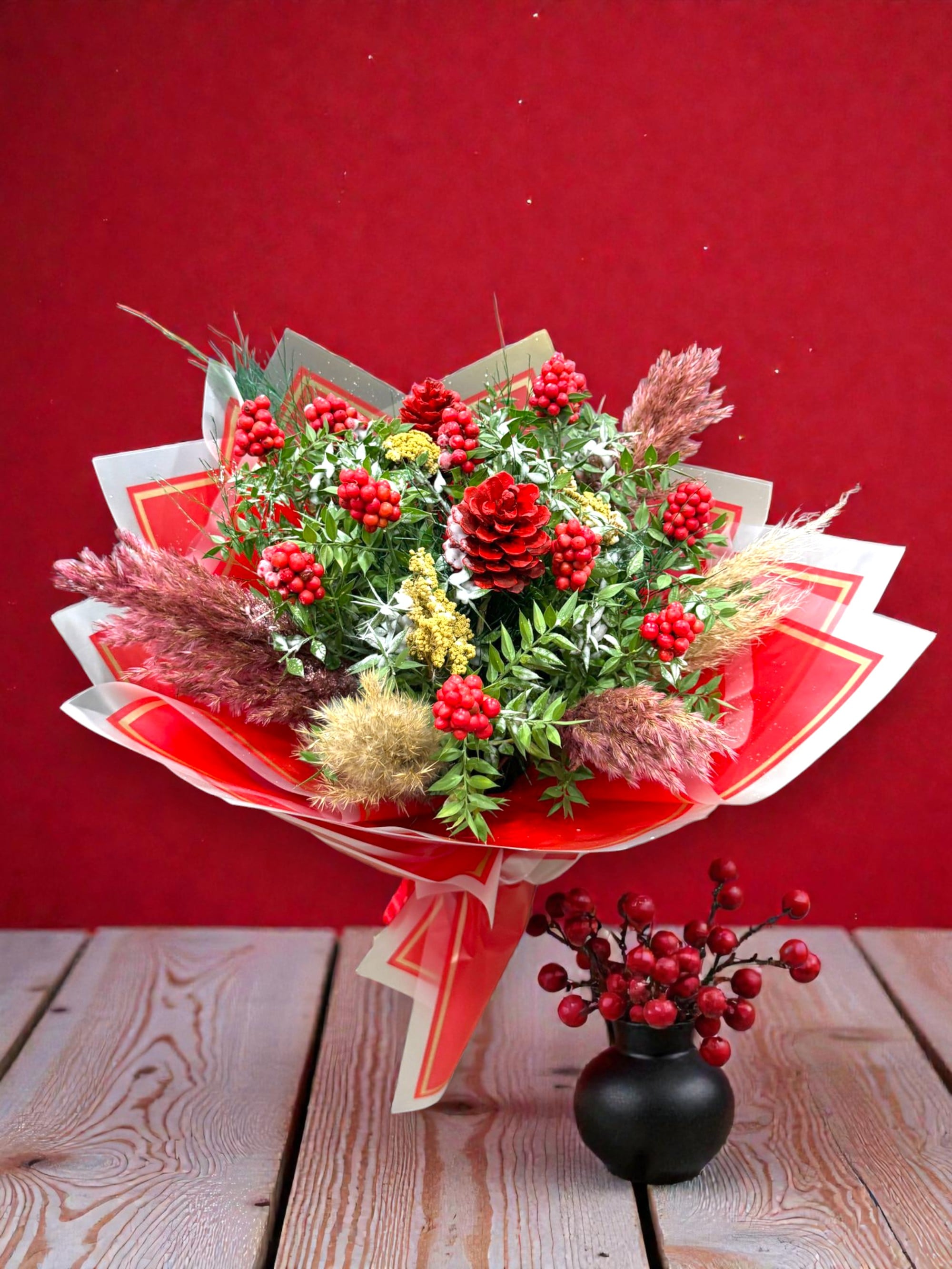 Kırmızının sıcak tonları, yeşilin doğal dokusu ve kış mevsiminin zarif detaylarıyla hazırlanan bu özel kokina buketi, hem estetik hem de anlam dolu bir tasarım sunar. Geleneksel kokina dallarının modern bir yorumla bir araya getirildiği bu buket, özellikle yeni yıl döneminin enerjisini taşır. Kırmızı taneler, çam kozalağı, kuru bitki dokuları ve yeşil yaprakların dengeli uyumu ile ortaya çıkan kompozisyon; yılbaşı hediyesi, tebrik, yeni iş, ev ziyareti veya özel kutlamalar için ideal bir seçenektir. Canlı görünümü uzun süre koruyan yapısı sayesinde dekoratif bir obje olarak da tercih edilebilir.