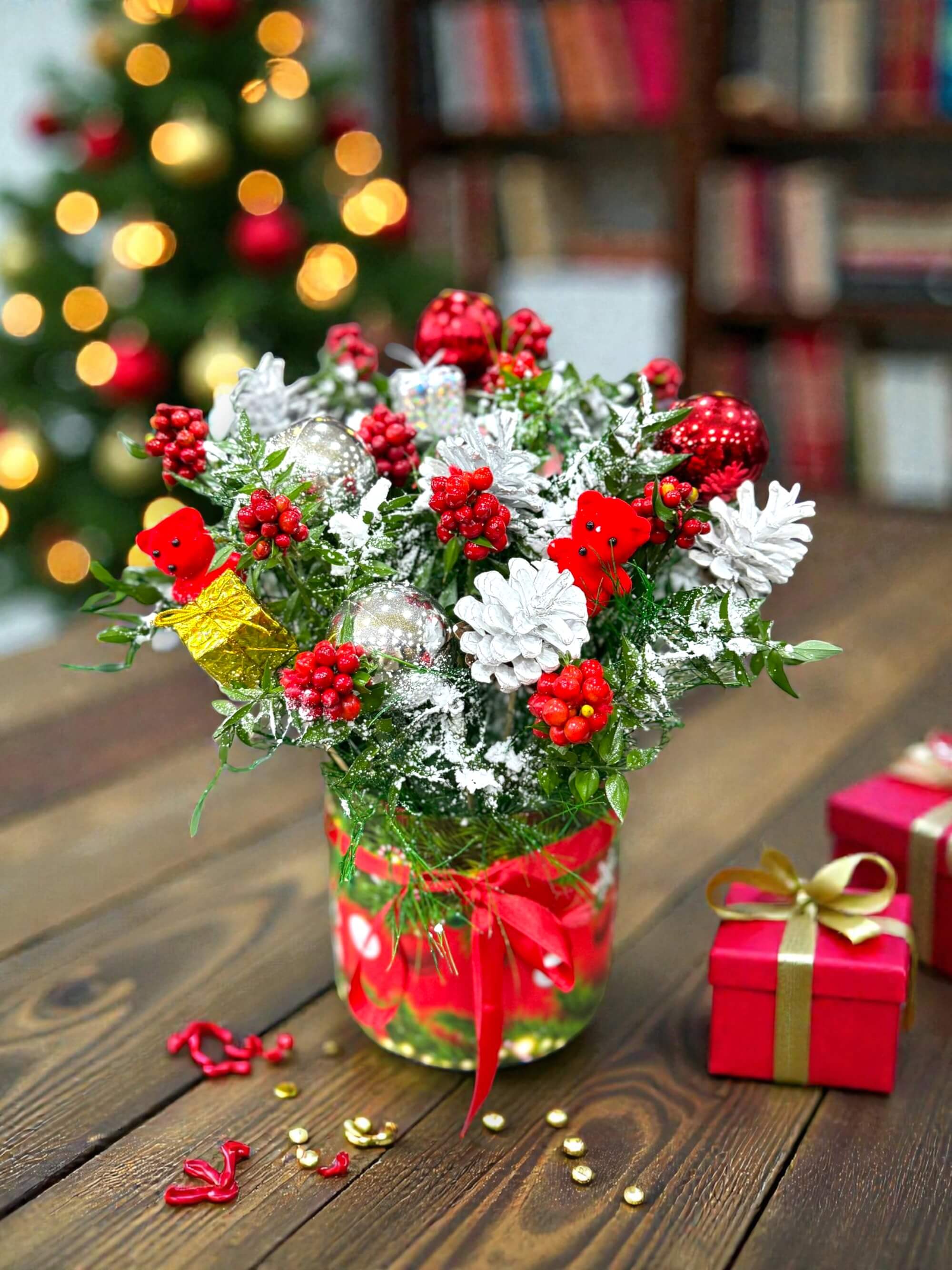 Dekoratif cam kutusu ve kırmızı kurdele detayı sayesinde yalnızca bir aranjman değil, aynı zamanda uzun süre kullanılabilir bir yılbaşı objesi olarak da öne çıkar. Loş bir ışıkta, yılbaşı ağacının yanında ya da çalışma masasında sergilenebilecek kadar şık ve etkileyici bir duruşa sahiptir.