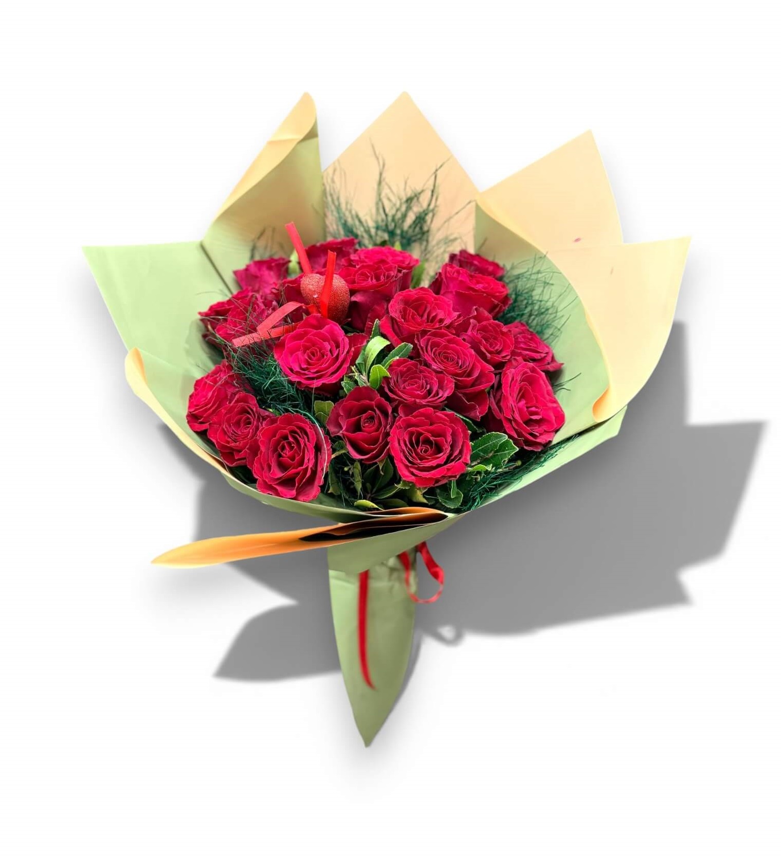 Modern Çift Renk Ambalaj: Güllerin canlılığını ön plana çıkaran, dışı yeşil içi krem/bej tonlarında lüks kağıt sargı.